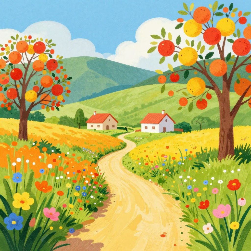 Vibrant, colorful illustration of a countryside scene with blooming wildflowers in orange, yellow, blue, pink, and red hues surrounding a winding yellow path leading to two small houses. Trees with bright red and yellow round fruits or flowers frame the scene, set against a backdrop of rolling green hills and a bright blue sky with soft clouds.