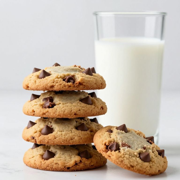 Stack of four chewy chocolate chip cookies in front of large glass of milk