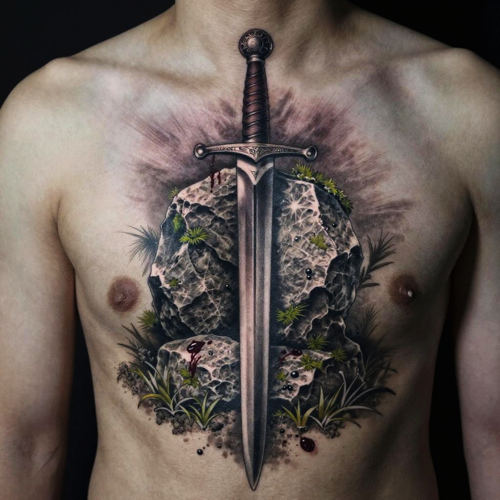 Realism sword tattoo spanning chest, depicting a Viking sword embedded in stone with moss and dirt, lifelike textures of metal and rock, realistic blood stains near blade, detailed engraving on the handle, dramatic lighting to enhance 3D effect, grayscale palette.