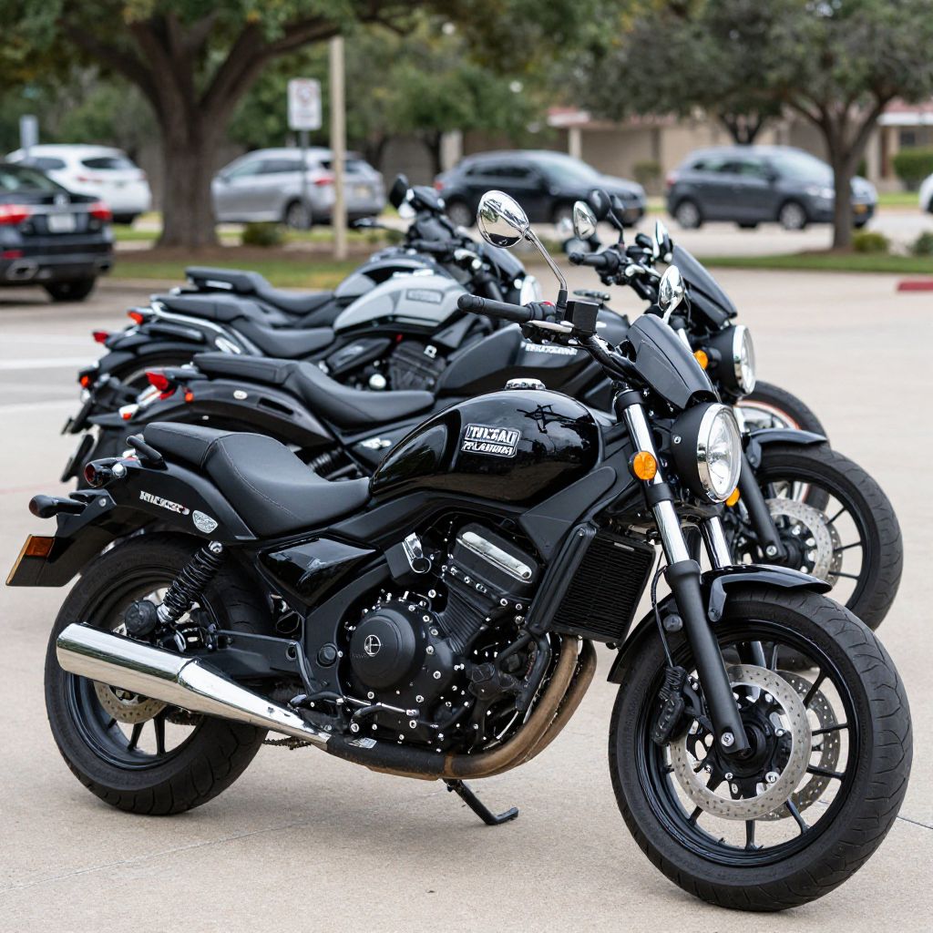 Photograph of four black motorcycles parked in a row on a paved surface. The motorcycles, with sleek, modern designs and chrome accents, are positioned from left to right. Each bike features black leather seats, silver exhausts, and prominent headlights. The background shows a blurred suburban setting with parked cars, trees, and buildings. The image has a high contrast with vibrant colors, highlighting the motorcycles' shiny surfaces and intricate details. The motorcycles' brand logos are visible on their fuel tanks. The overall style is sharp and vivid, emphasizing the motorcycles' design and presence.