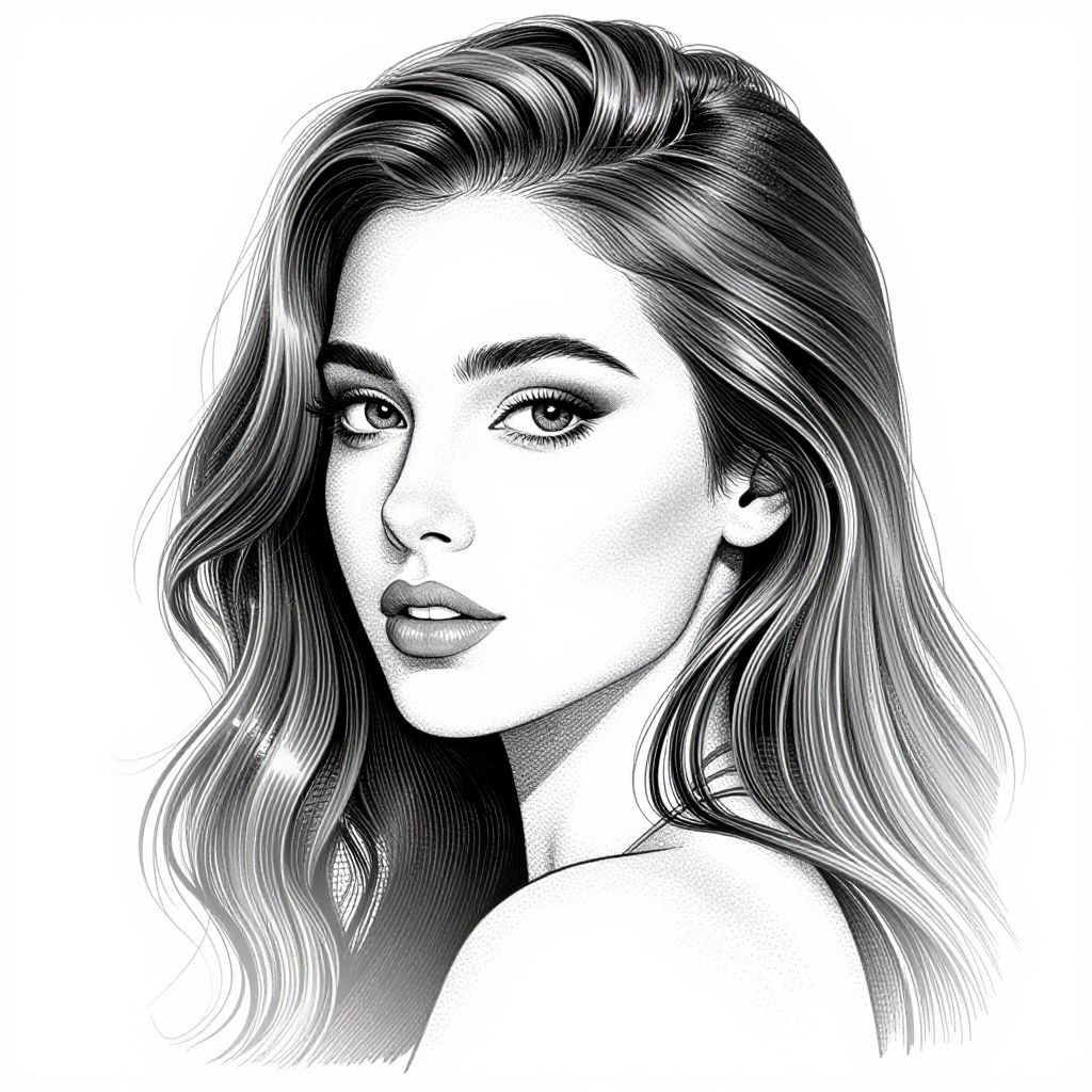 Monochrome digital drawing of a beautiful woman with long, wavy hair, gazing softly at the viewer, detailed with fine line work.