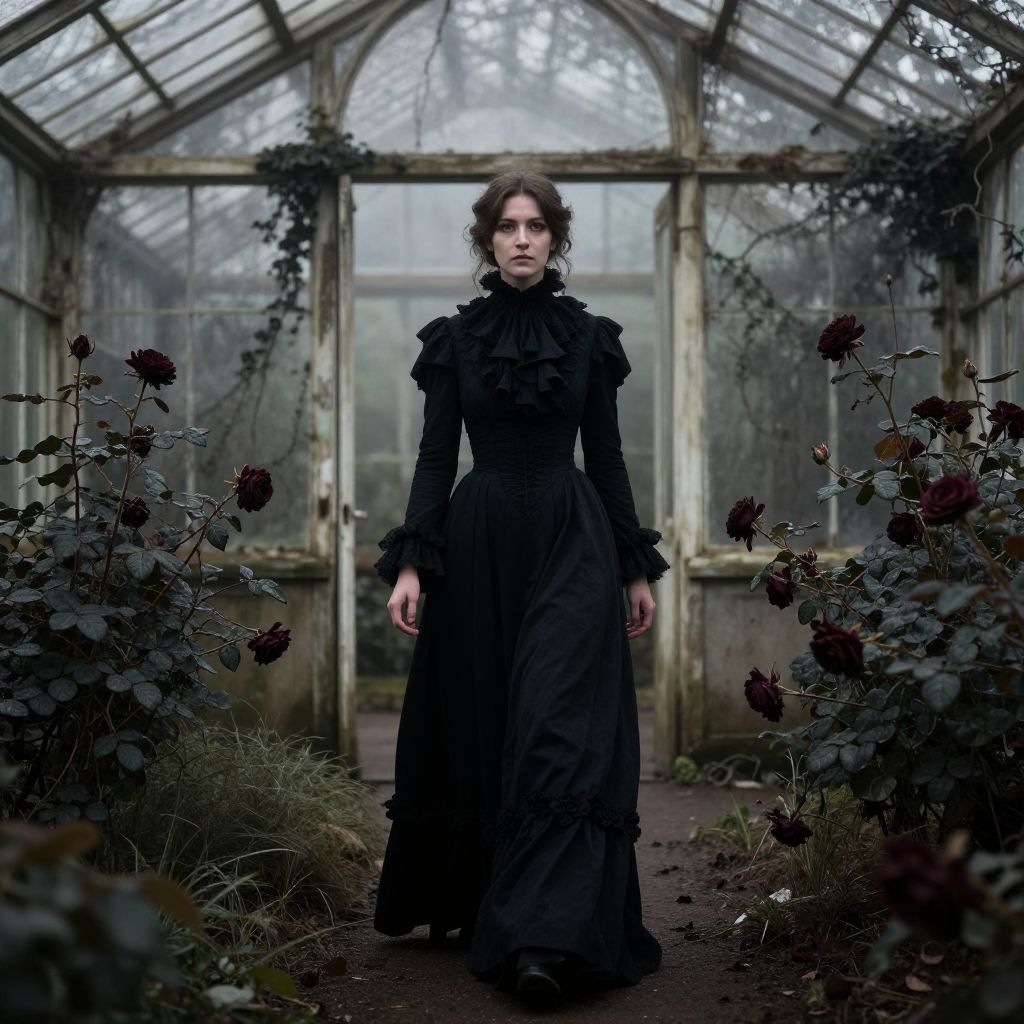 Photograph of a pale-skinned woman with dark, wavy hair standing in a dilapidated greenhouse. She wears a long, black, Victorian-style dress with ruffled sleeves and a high, ribboned collar. The greenhouse has a glass-paneled roof and walls, with vines and tall, dark red roses on both sides. The lighting is dim, creating a moody, eerie atmosphere. The woman's expression is serious, and she stands centered in the image, looking directly at the camera. The greenhouse floor is dirt, adding to the decayed appearance. The overall color palette is muted, with dark greens, blacks, and the occasional red from the roses.