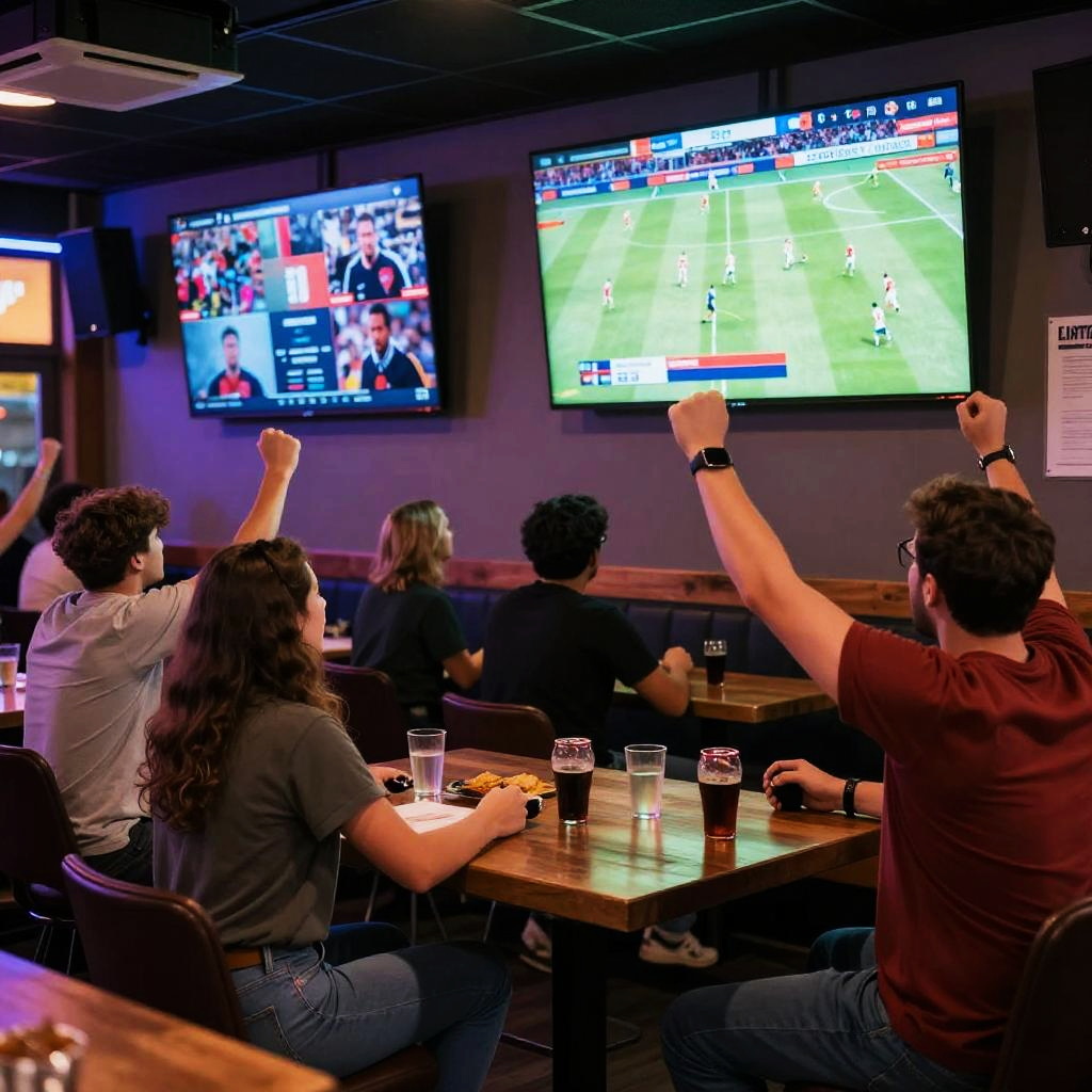 Livetvsports dynamic scene showcasing a vibrant sports bar filled with enthusiastic fans watching multiple live sports channels on oversized screens, energetic atmosphere, neon lights reflecting team colors, detailed fans cheering, action-packed game moments