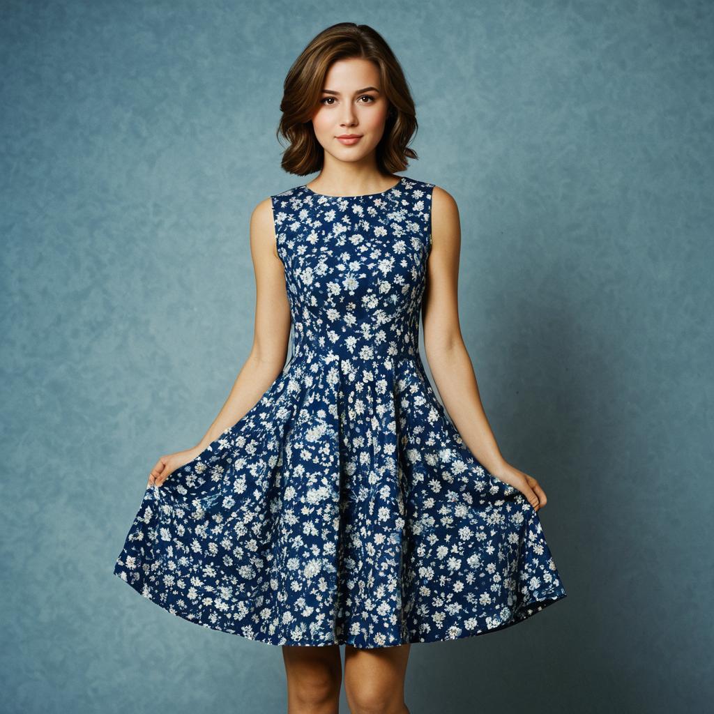 Portrait of a young woman with brown hair and brown eyes wearing a sleeveless blue dress with a white floral print. She is standing against a textured blue background, holding the sides of her dress. The dress is knee-length with a fitted bodice and flared skirt.