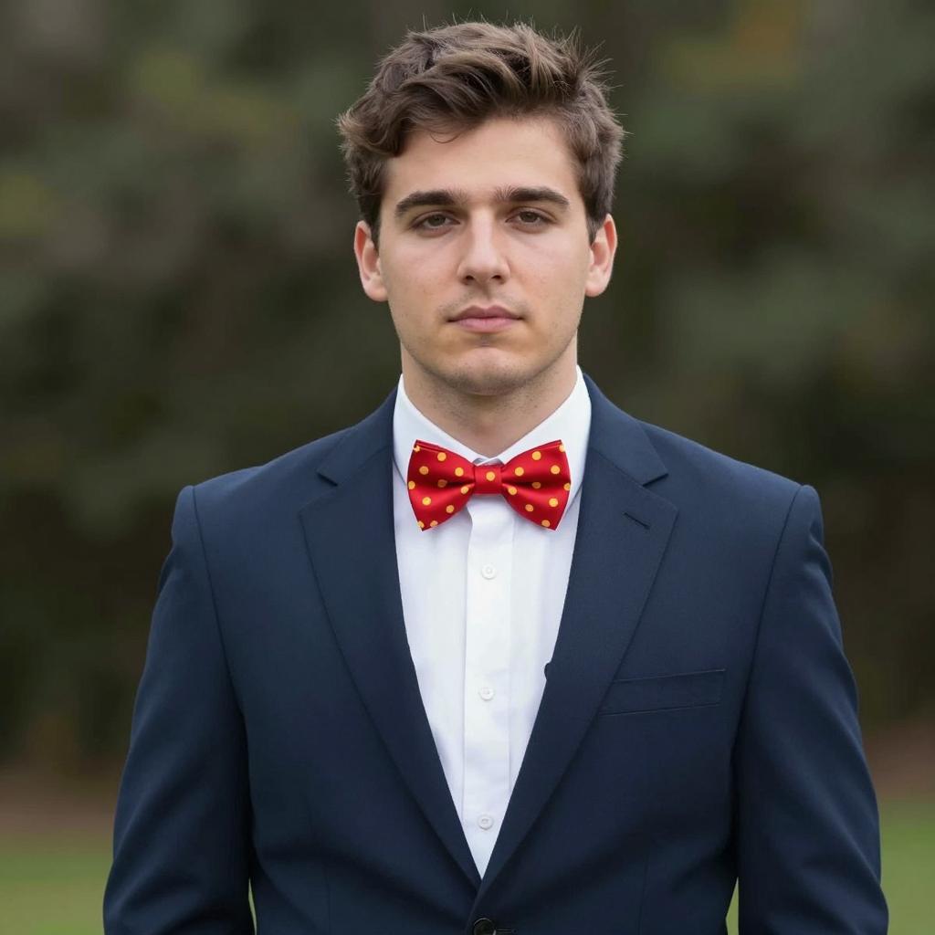 Funny fancy dress costume, photorealistic portrait of a handsome young man, medium build, light skin, short brown hair styled upwards, slight stubble, wearing a dark blue suit with a white shirt and a red bow tie with yellow polka dots, standing outdoors, blurry green plant in the background, soft natural light, neutral expression, professional appearance, close-up, upper body, casual style, daytime, slight shadow on face