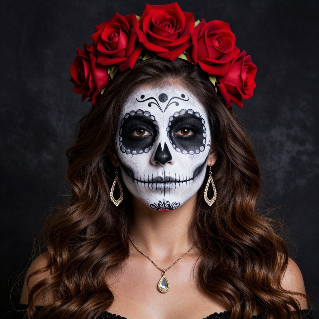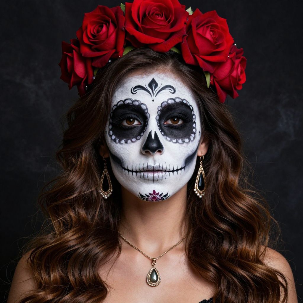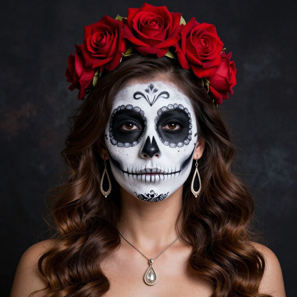 Glamorous calavera portrait featuring a woman adorned with a striking black and white sugar skull makeup, complemented by a vibrant crown of red roses, long wavy brown hair, dangling earrings, and a delicate necklace with a teardrop pendant, set against a dark, textured background.