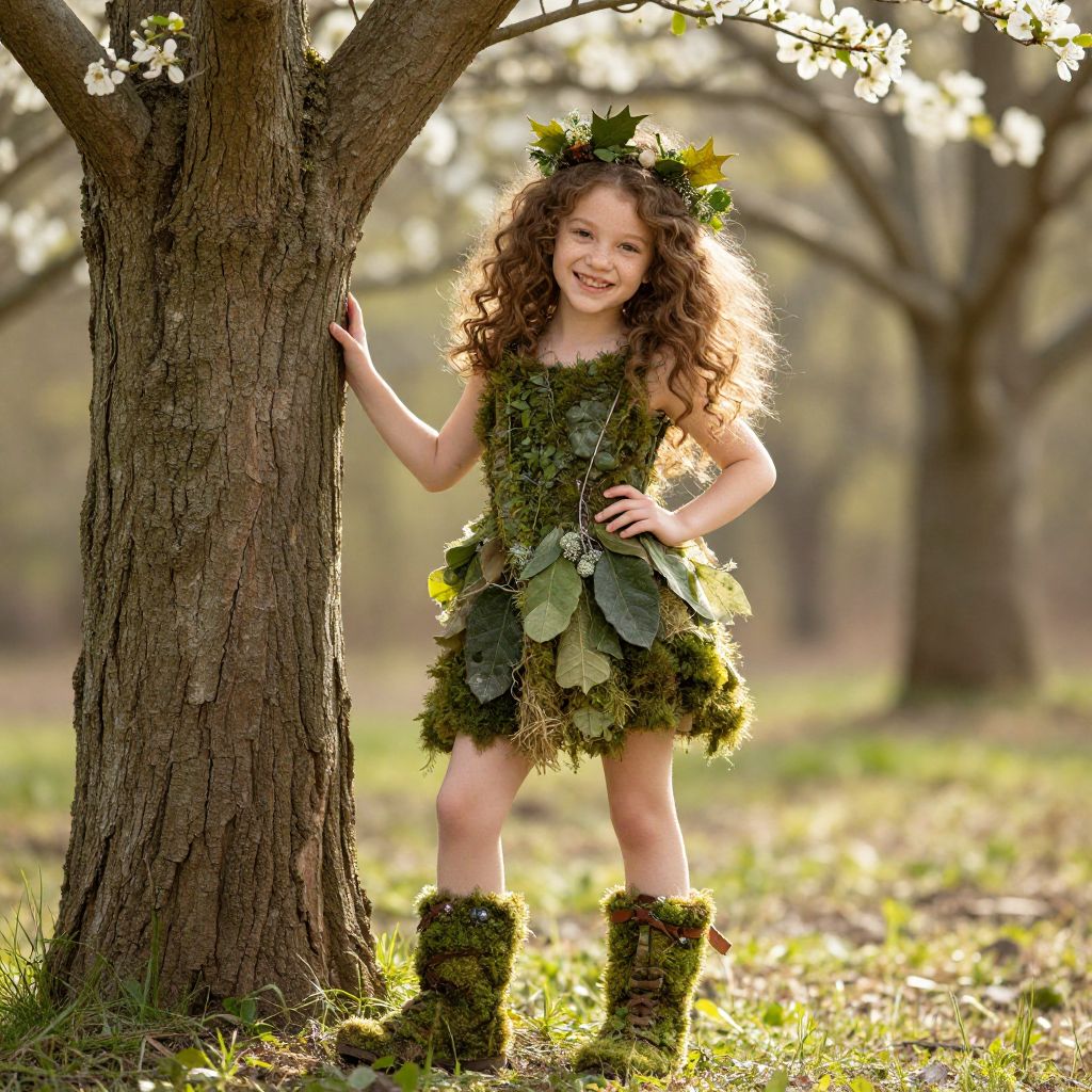 A joyful young girl with a voluminous, naturally curly hairstyle wears a magical forest-themed costume complete with moss-covered boots and a leafy crown, posing next to a blooming tree in a sun-drenched forest clearing, her face bright and lively with freckles and a warm smile.