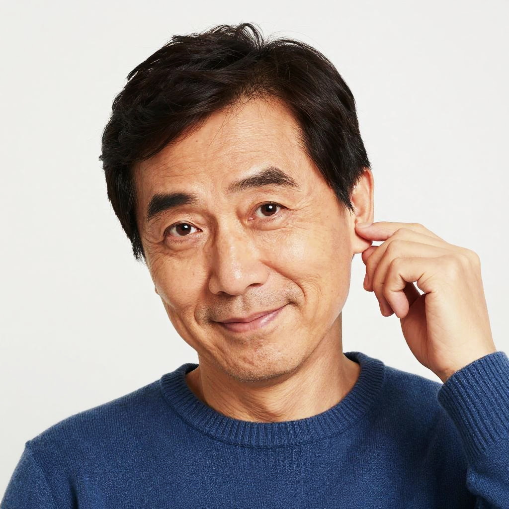 Photograph of a middle-aged man with short, dark brown hair and light skin, wearing a blue, knitted sweater. He has brown eyes, a slight smile, and is touching his left ear with his right hand. The background is completely white, making him the sole focus of the image. The texture of the sweater is visible, and the lighting is even, highlighting his facial features and the color of his sweater. The overall style is clean and professional.