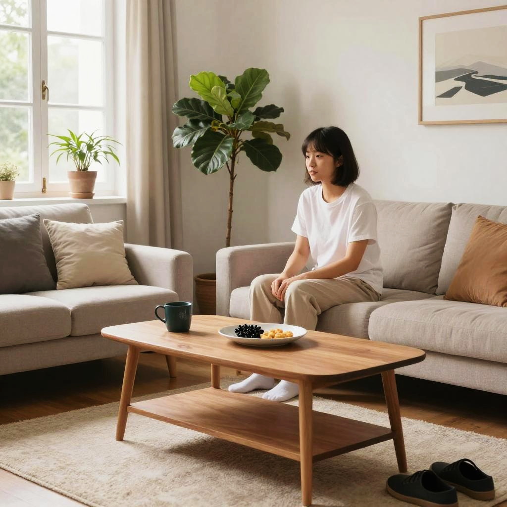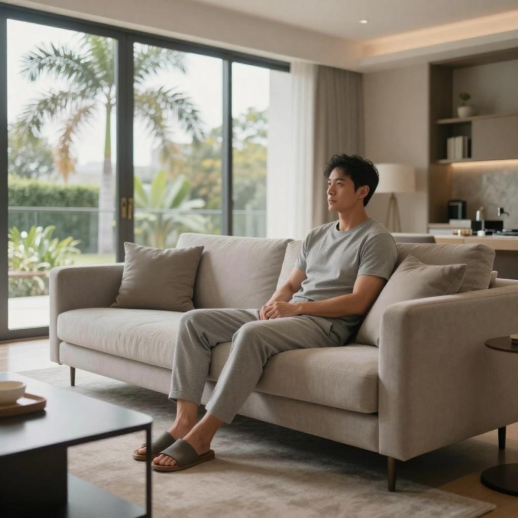 A young Asian man wearing a grey t-shirt and matching pants sits comfortably on a beige modern couch in a bright, stylish living room. The room features large floor-to-ceiling windows that showcase a view of palm trees outside, creating a serene and elegant atmosphere. The interior includes neutral tones, soft cushions, and minimalistic decor with a carpet and a black coffee table.