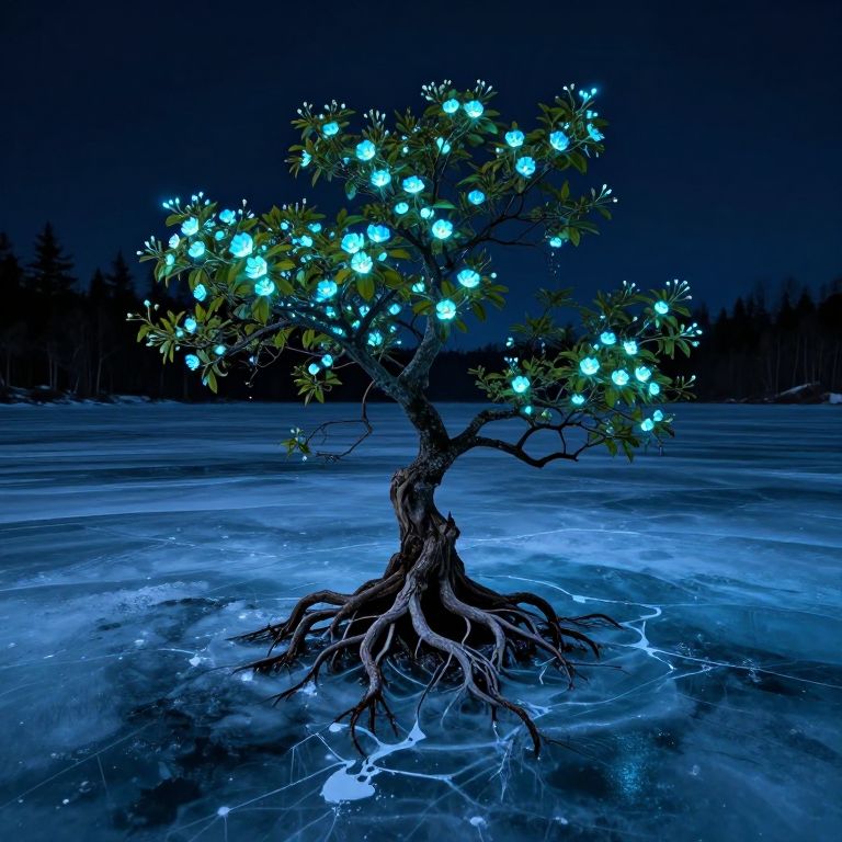 Photograph of a surreal, glowing tree standing in a frozen, dark blue lake at night. The tree has a twisted, dark brown trunk with exposed roots emerging from the icy surface. Its branches are adorned with luminescent, blue-green glowing orbs, resembling fairy lights, that illuminate the surrounding area. The background features a dark, silhouetted forest. The ice on the lake has a reflective, glass-like texture, with cracks and lines glowing blue, enhancing the magical, otherworldly atmosphere. The overall scene is vividly colored, with deep blues and greens contrasting against the dark background.