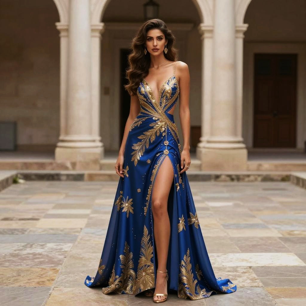 A stylish woman with long wavy dark hair wearing a floor-length blue evening gown adorned with intricate gold floral embroidery. The dress features thin straps, a deep V neckline, and a high slit showcasing her legs. She stands confidently in a historic courtyard with large stone arches and tiled flooring.