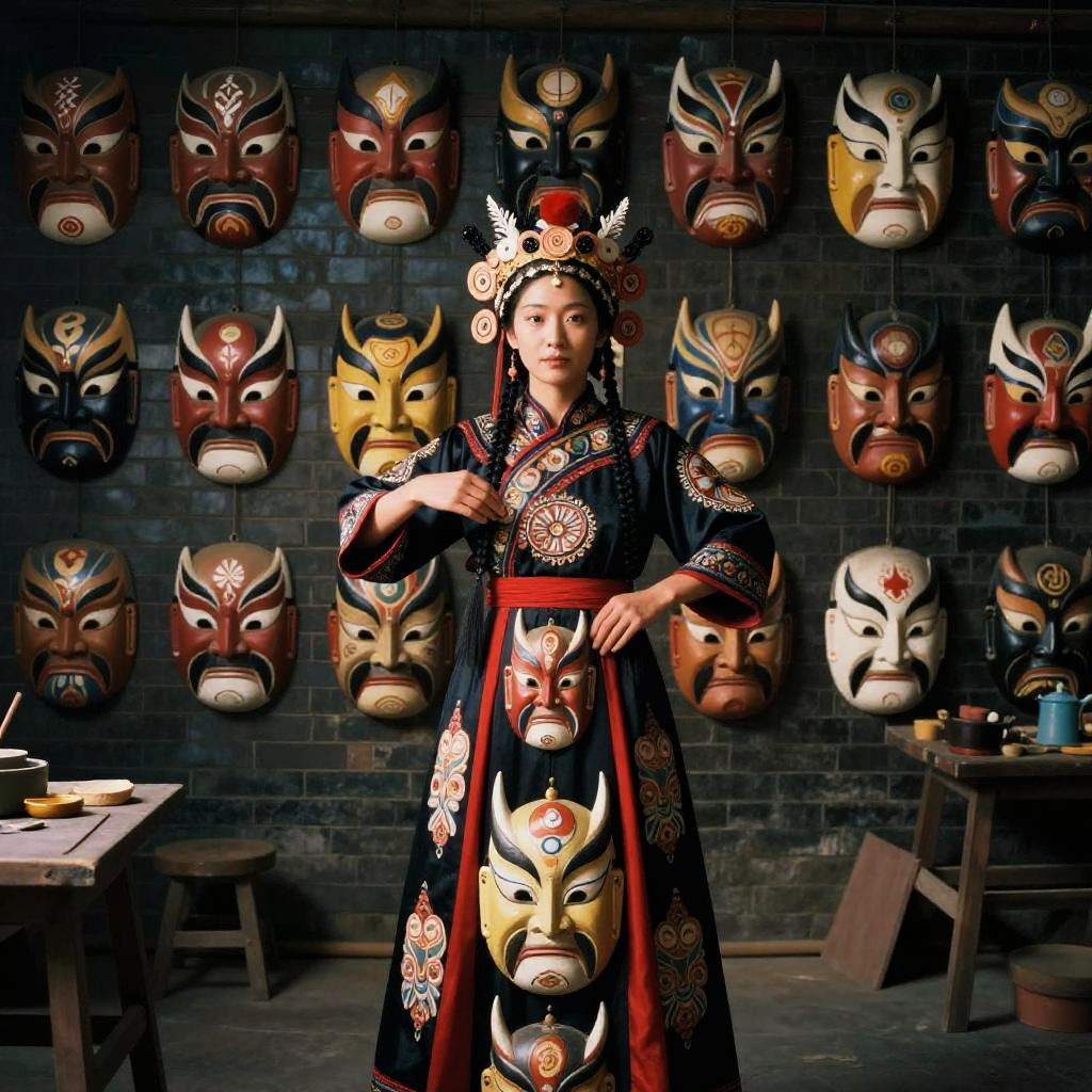 Cinematic still At a traditional Chinese mask-making workshop, an asian woman in a Nuo dance-inspired costume posed, her dress echoing the enigmatic masks and their cultural significance.. emotional, harmonious, vignette, 4k epic detailed, shot on kodak, 35mm photo, sharp focus, high budget, cinemascope, moody, epic, gorgeous, film grain, grainy, fine detail, polished, complex artistic color, cinematic, intricate, extremely coherent, dramatic light, colorful, iconic, dynamic composition, rich vivid colors, illuminated background, beautiful surreal atmosphere, creative, positive, unique, engaging, attractive, innocent, symbolic, perfect, symmetry, relaxed, clear, aesthetic, great, pure
