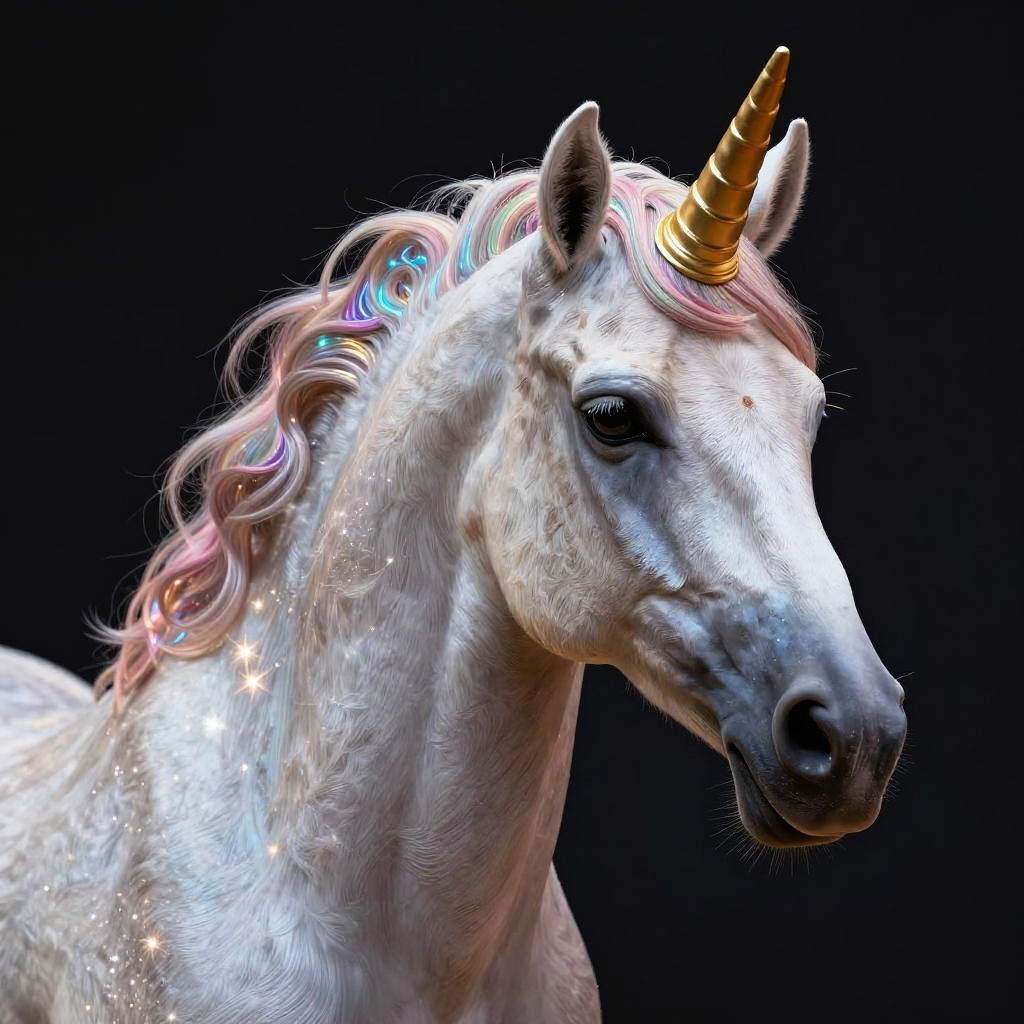 Close-up portrait of an ultra-realistic unicorn with a golden horn, pastel-colored mane, and sparkling glowing effects against a black background. The image features intricate, high-resolution details emphasizing the unicorn's glossy coat and vibrant colors.