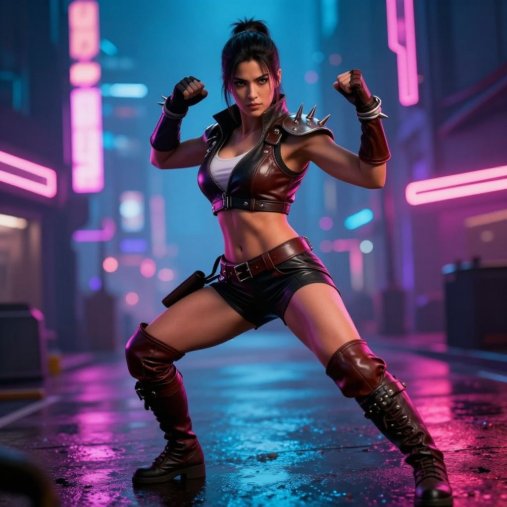 A vibrant CGI image of a fierce, muscular woman in a neon-lit, cyberpunk city street. She has dark hair in a high ponytail, wears a black leather crop top, matching short shorts, spiked wristbands, and knee-high boots. Her toned midriff and abs are exposed, and she strikes a powerful fighting stance with fists raised. The background features glowing blue and pink neon signs, wet pavement reflecting the lights, and blurred urban buildings, creating a dynamic, futuristic atmosphere. The woman's intense expression and confident posture suggest readiness for combat.