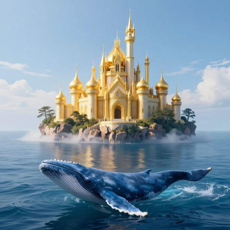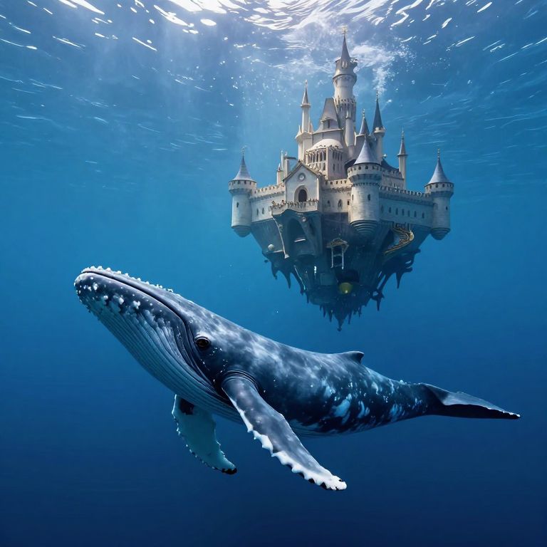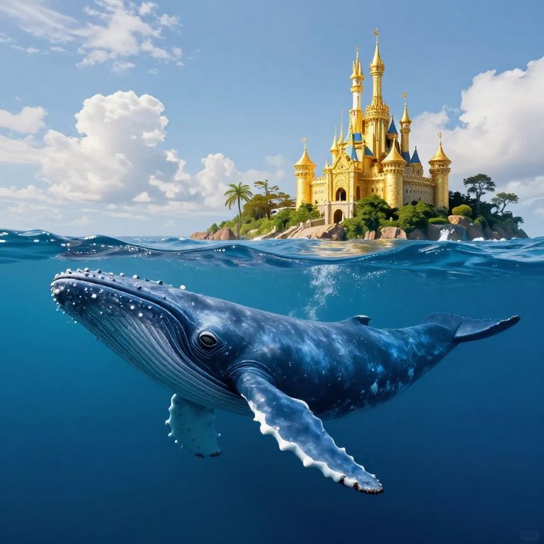 Photorealistic digital artwork of a majestic blue whale with a textured, slightly mottled surface, flying through a bright blue sky filled with fluffy white clouds. The whale supports a whimsical, fairy-tale castle with multiple turrets and a golden spire, adorned with tiny figures. Surrounding the whale are several birds in mid-flight. The castle's architecture is reminiscent of Disney's Cinderella Castle, with intricate detailing and light beige and blue hues. The image combines fantasy elements with realistic textures, creating a magical, surreal atmosphere.