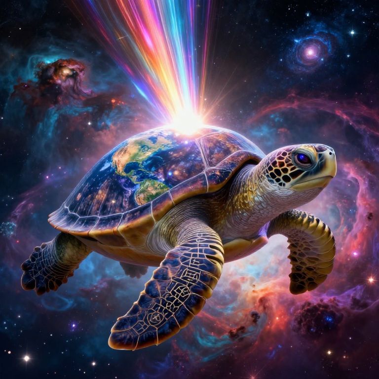 \"A colossal, ancient cosmic turtle floating in a vibrant, colorful universe, Its enormous shell carries the entire Earth, rendered in intricate detail, From the center of the turtle's shell, a brilliant, pulsating beam of light extends infinitely in both directions, cutting across the cosmos, The beam is a blend of shimmering colors, suggesting immense energy and importance, The turtle's eyes are wise and ancient, reflecting swirling galaxies and distant stars, The shell is weathered and etched with mystical symbols and patterns, Surrounding the turtle is a spectacular cosmic landscape with vivid nebulae, colorful gas clouds, and dazzling star clusters, The scene seamlessly blends oceanic and terrestrial elements on the turtle's back, with shimmering waters and diverse landscapes visible on Earth, The entire image is rendered in a hyper-detailed, majestic, and surreal style, emphasizing the epic scale and cosmic significance, Vibrant colors, sharp contrast, ethereal glow