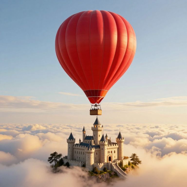 A vibrant 3D-rendered scene depicts a colossal red hot air balloon soaring gracefully through a serene sky, lifting a miniature medieval castle above a sea of golden clouds, evoking a fantastical and dreamlike atmosphere reminiscent of whimsical digital art.