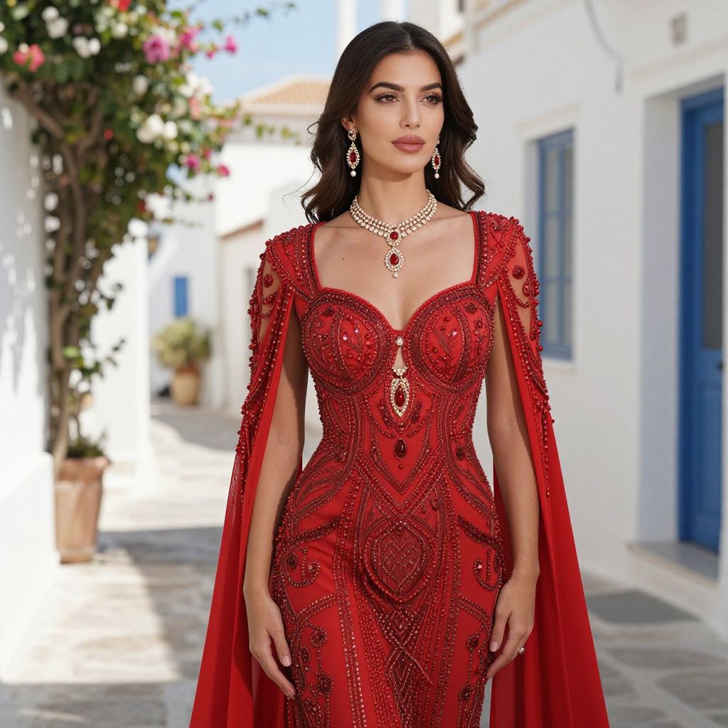 Elegantly poised woman in a vibrant red, intricately embellished gown and matching jewelry stands confidently against a sunlit Mediterranean street backdrop, exuding timeless glamour inspired by La Reina.