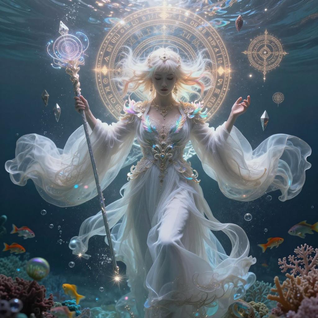 Full body, masterpiece, best quality, 3d, realistic, hdr, photoreal, mysterious oceanic sorceress, in moonlit bioluminescent tidepool terrace inside a coastal cavern, dripping stalactites, floating lantern-jellyfish, glassy tide-reflections, phosphorescent algae carpets and a veil of sea-foam mist, casting an ethereal spiral of glowing azure water and shimmering salt crystals, whimsical particles and tasteful sparkle, ornate robes and staff, wind-whipped cape, cinematic rim light, volumetric fog, subsurface scattering, ray-traced reflections, PBR materials, dynamic pose, ultra-detailed fabrics and skin, crisp focus, shallow depth of field, 85mm lens, filmic color grading, high contrast, moody atmosphere, natural color science, subtle film grain