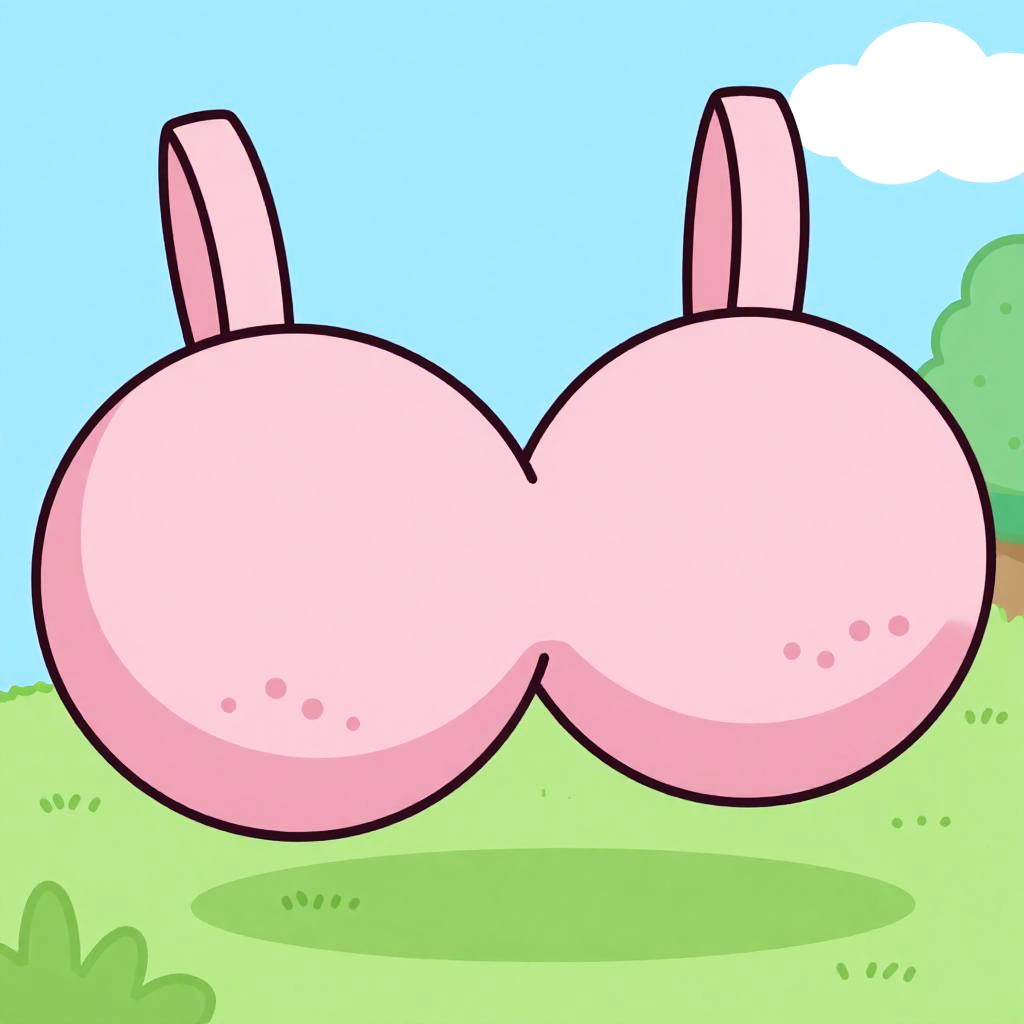 Huge fake breasts in a playful cartoon style, bright colors, exaggerated proportions, fun and energetic vibe, clean lines and smooth shading, whimsical background