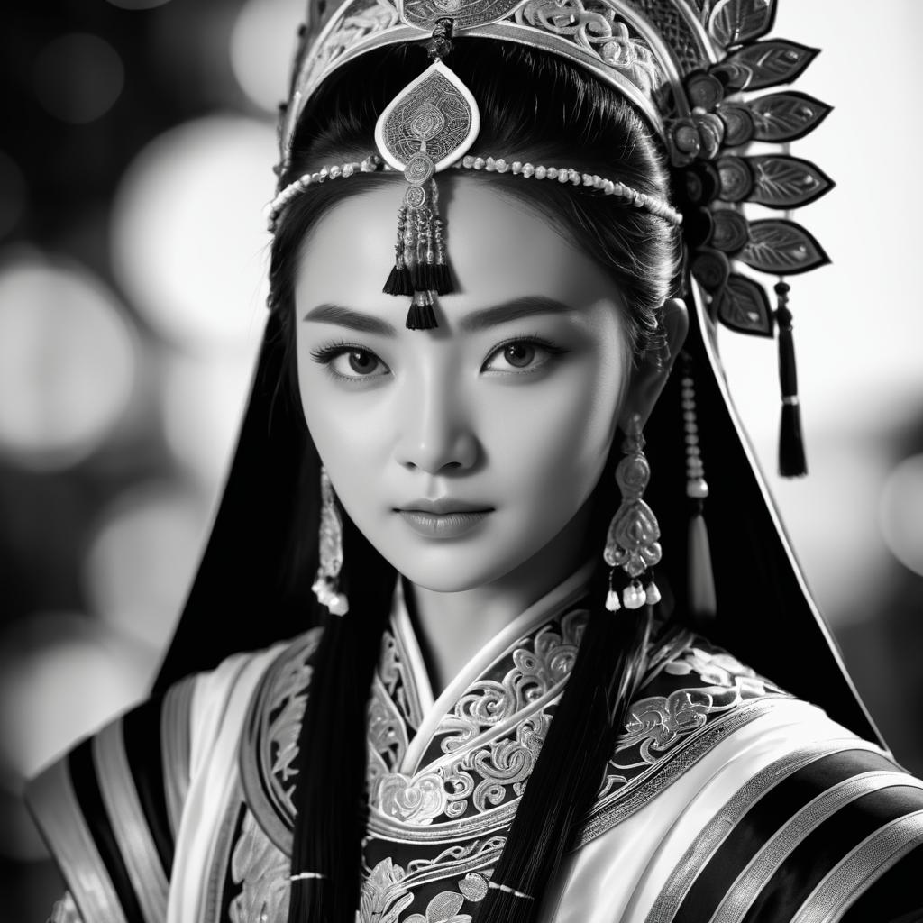 Fabric Painting asian, female, warrior, princess ::5 Premium Portrait Photography::4 well-lit, sharp-focus, high-quality, artistic, unique, award-winning photograph, Canon EOS 5D Mark IV DSLR, f/8, ISO 100, 1/250 second, close-up, natural light, professional, flattering, headshot, glibatree style::3 black and white, grainy, deformed, watermark::-2,