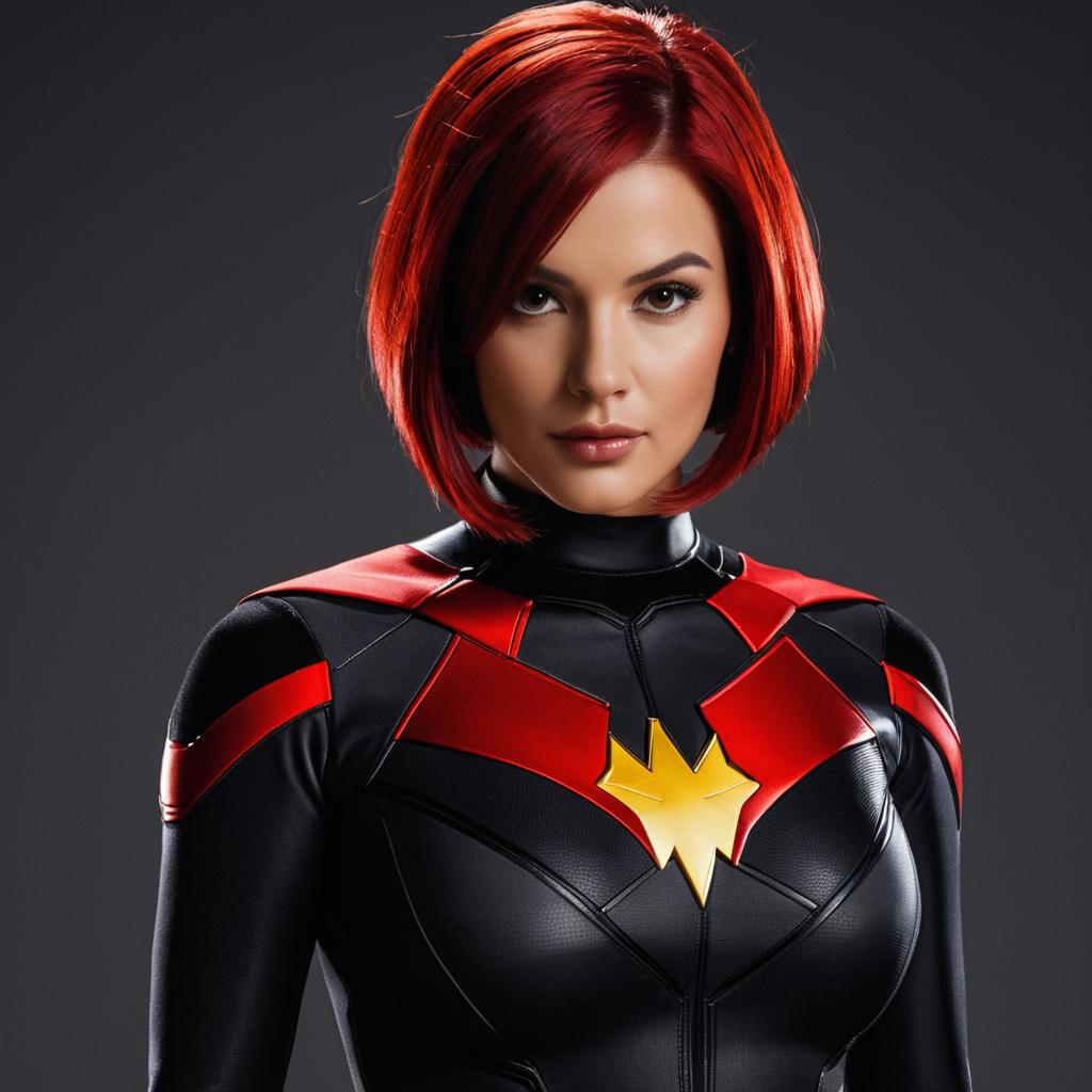 Xmen cosplay, photorealistic, close-up, Marvel character, female, red hair, short and messy, intense expression, blue and yellow leather suit, Avengers emblem on shoulder, high collar, muscular build, detailed ures, indoor background, dim lighting, realistic skin tones, CGI, cinematic quality, action hero, superhero outfit, professional photography style