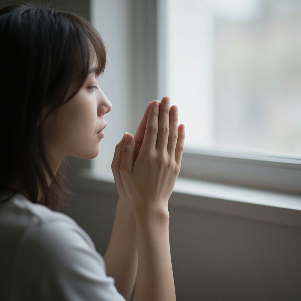 In a quiet moment of introspection, a woman's clasped hands reach toward the light streaming through the window, embodying a silent plea for solace and a yearning for connection amidst the stillness of her soul.