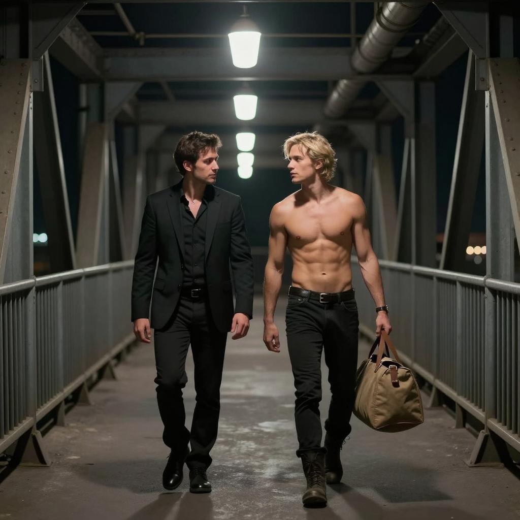 Two men walking in a dimly lit industrial metal bridge. The man on the left is short with dark hair, wearing a black suit. The man on the right is tall with blonde hair, shirtless, wearing black pants and boots, carrying a large brown bag. Overhead lights hang from the metal trusses. Metal railings line both sides.