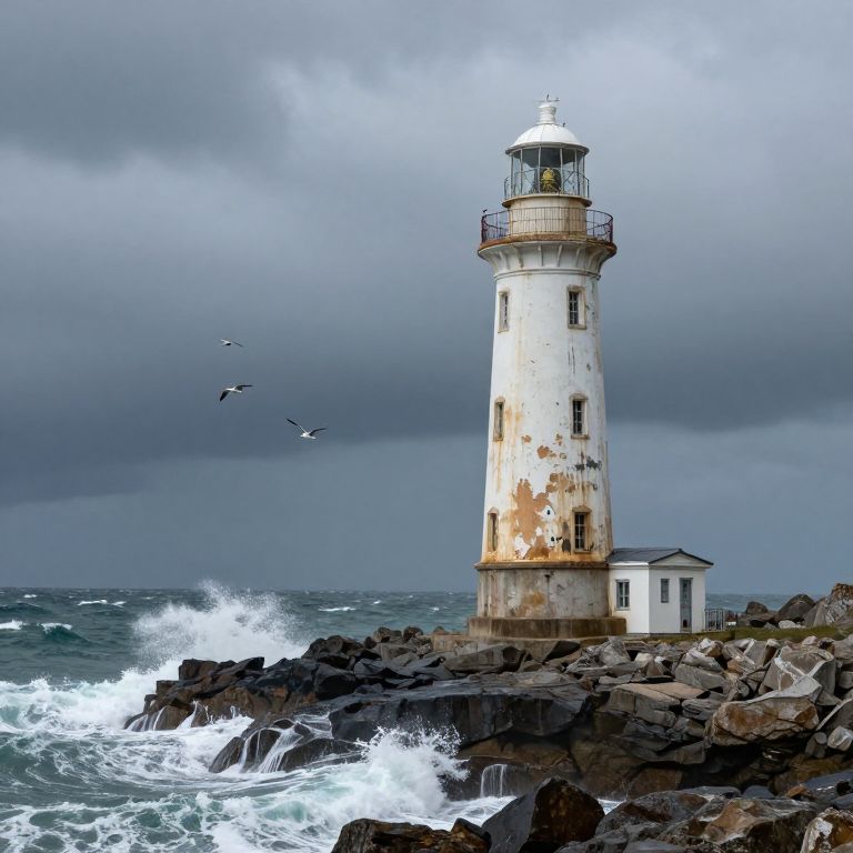 Former lighthouse standing tall on a rugged cliff, weather-beaten and covered in peeling paint, waves crashing against rocks below, seagulls flying over turbulent sea under a stormy sky, symbolizing endurance and solitude