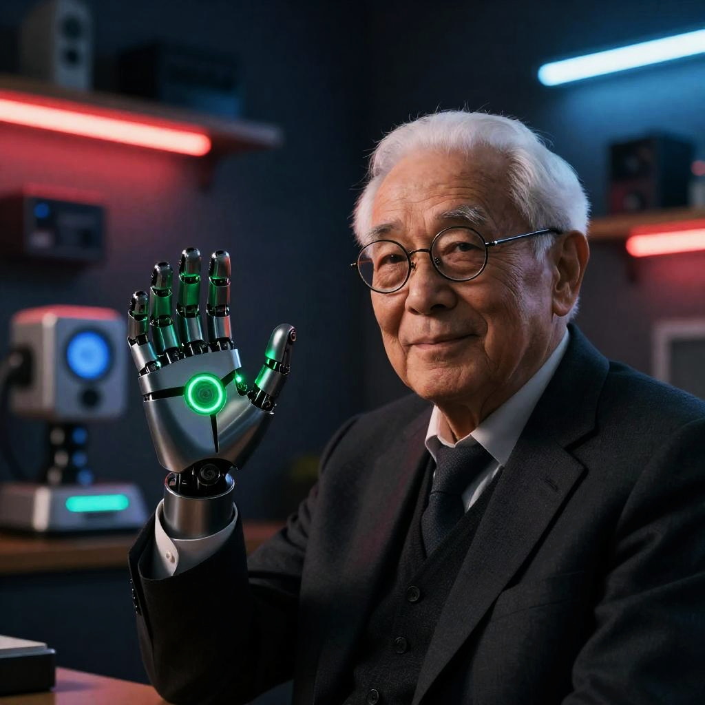 Old man with short white hair, round glasses, and dark suit, holding robotic hand with glowing green lights. Red and blue neon lights illuminate background shelves and futuristic device on the left. Smiling slightly. Indoor setting, dim lighting.