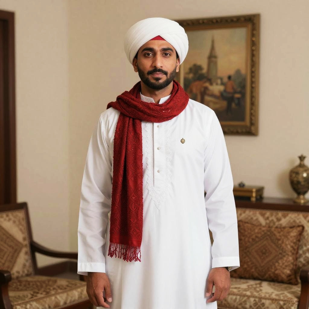 Portrait of a South Asian man wearing a traditional white turban, white embroidered sherwani, and a red patterned scarf, standing in a decorated room with vintage furniture and framed artwork.