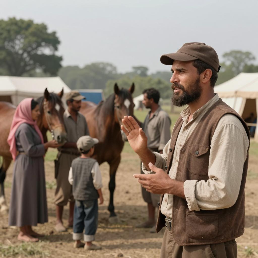 Man with brown skin, dark beard, wearing brown hat and patterned brown poncho, holding paper, standing in profile. Blue sky, mountain background. Light clouds. Side view, serious expression. Daytime.