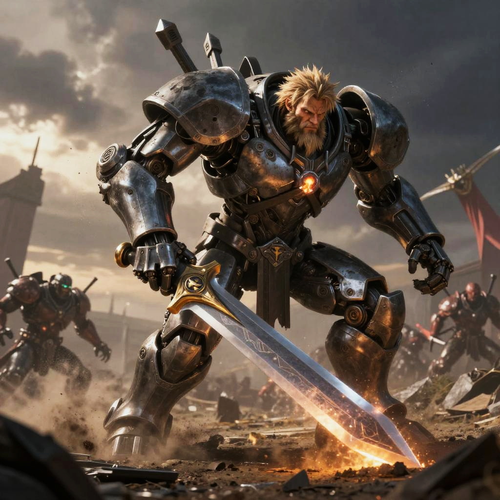 Epic showdown between Urgot and Garen on a battlefield at dusk, gritty and dramatic style, Urgot's mechanical limbs clashing with Garen's glowing sword, swirling dust and magic energy around, dark moody color palette, hyper-realistic textures.