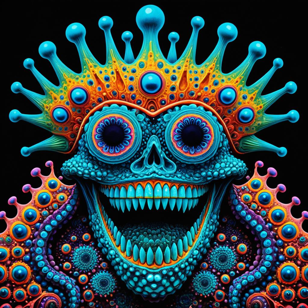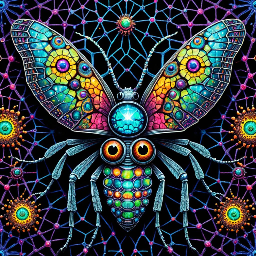 Extremely hyperrealistic, ultra-textural, trippy surreal luminous octopus entity with pulsating arms, covered in crazy psychedelic human compound eyes, swirling ink patterns, oil slick rainbow sheen effect, holographic and translucent textures, vivid colors with bright pastels and tons of light, featuring undulating forms, intricate silica frustules, complex valve morphology, geometric and symmetrical forms, radial, capturing a diverse, delicate, and surreal microscopic world.