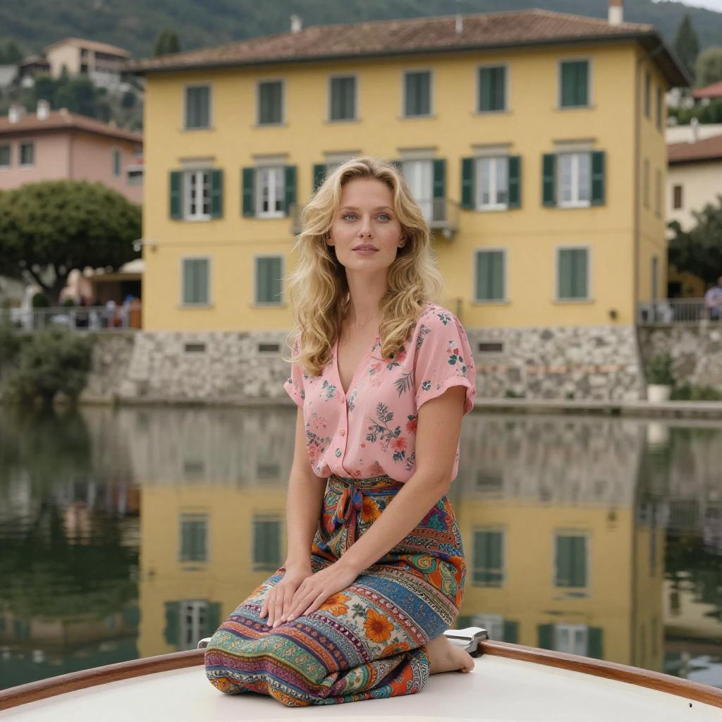 Photograph of a blonde woman with fair skin and blue eyes, kneeling on a boat's deck. She wears a pink floral blouse and a colorful, patterned skirt. Behind her, a yellow building with green shutters and a stone facade is reflected in a calm river. The background includes other buildings and trees on a hillside.