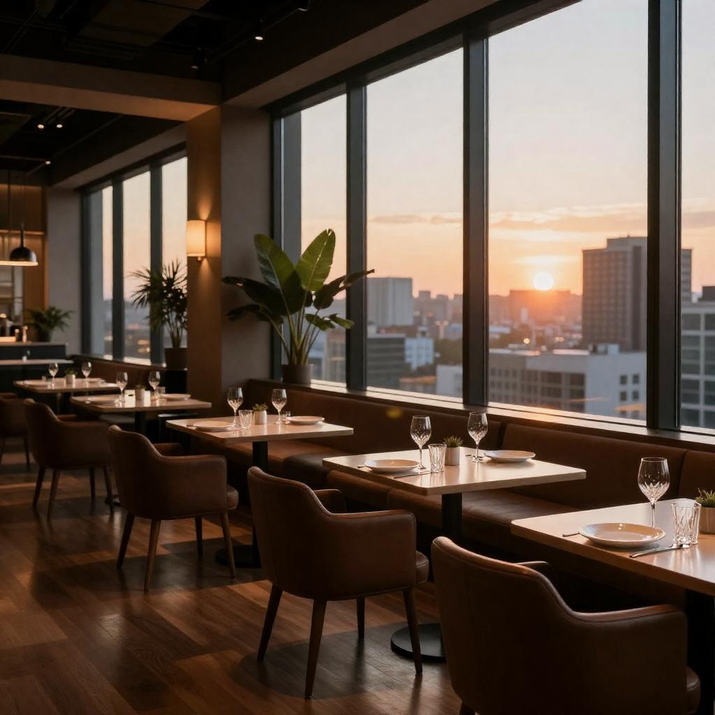 Photograph of a modern, upscale restaurant with large floor-to-ceiling windows revealing a cityscape at sunset. The interior features warm lighting, dark wood floors, brown leather chairs, and neatly set tables with white plates and crystal glasses. Potted plants add greenery to the sleek, contemporary decor. The warm sunlight contrasts with the dark interior, creating a cozy yet elegant atmosphere.