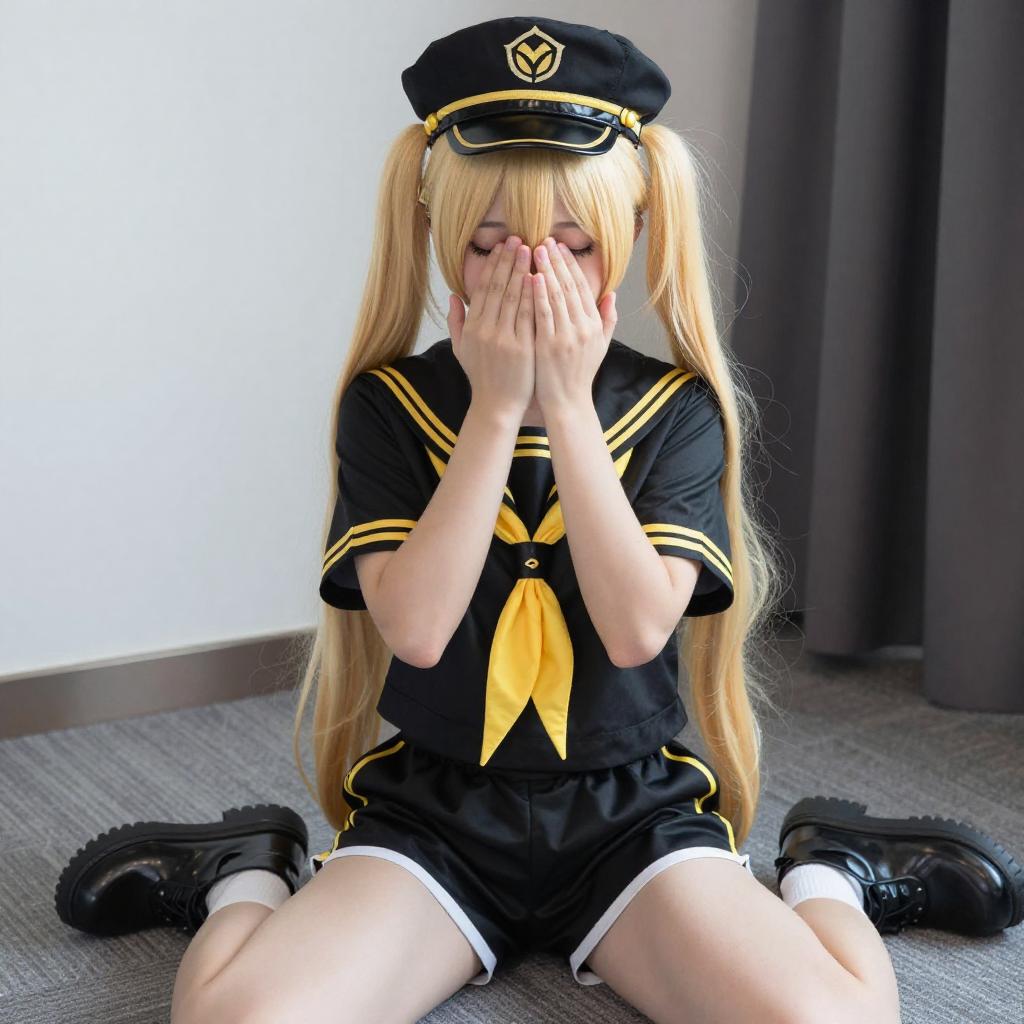 Photograph of a blonde woman with long hair in pigtails, wearing a black sailor-style outfit with a yellow bow, and a black hat with a gold anchor. She is on her knees, looking up with wide eyes and an open mouth, as a hand extends from the left, touching her tongue. Background includes a white wall and gray curtain.