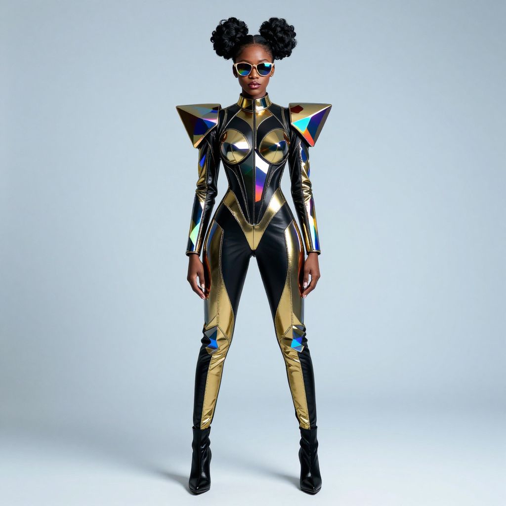 The image features a strikingly beautiful black woman, adorned in a futuristic, prism-inspired outfit that extends from head to toe. Her intricate black hairstyle, styled in two voluminous buns, complements her sharp, symmetrical face. She is wearing prism sunglasses that add to her avant-garde appearance. The outfit itself is a symmetrical masterpiece, with a metallic sheen and a combination of black and gold hues. The bodysuit is form-fitting, accentuating her figure, and is complemented by high-heeled boots. The background is a gradient of light blue, providing a stark contrast to the vibrant colors of her attire. The overall composition is balanced, with the woman standing centrally, her body aligned with the vertical axis of the image. The intricate details and the interplay of colors create a visually captivating scene.
