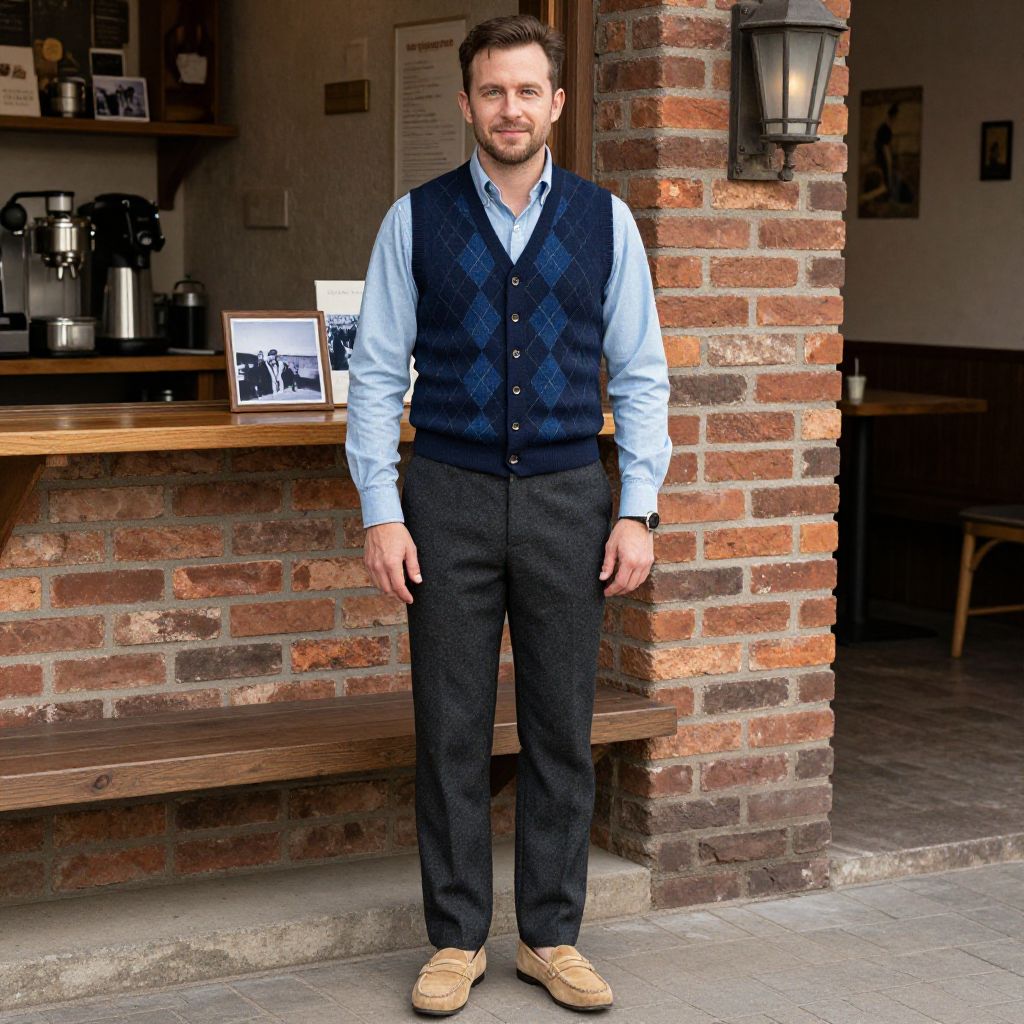 A man, classic country style, navy blue argyle vest, charcoal wool trousers, light blue chambray shirt, tan suede loafers, rustic brick exterior, cozy waiting area with coffee station, vintage photo, relaxed smile, warm ambiance. Man has masculine face and piercing eyes