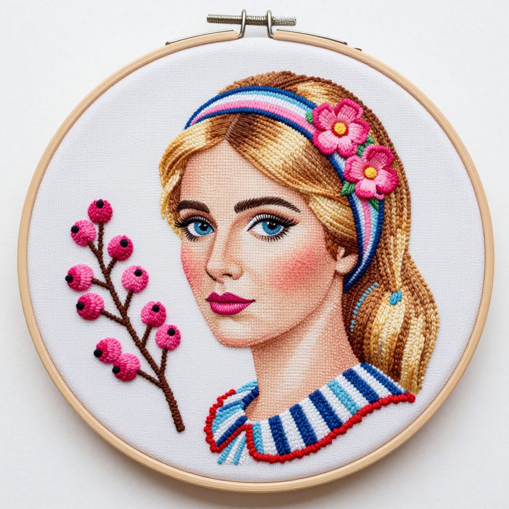 This is a vibrant, digital cross-stitch-style drawing of a blonde woman with fair skin and blue eyes, framed in a wooden hoop. She wears a blue and white striped headband adorned with pink flowers and a matching striped collar. Her lips are painted bright pink, and she has a slight smile. To her left, there's a small branch with three pink berries. The background is plain white, highlighting the colorful subject. The cross-stitch technique creates a textured, grid-like pattern, adding depth to the image. The style is reminiscent of folk art with a modern twist.