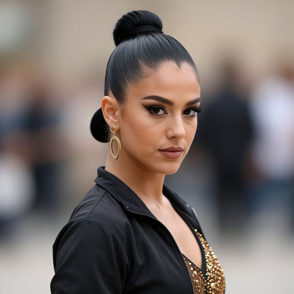Photograph of a confident woman with medium tan skin and sleek, black hair styled in an elegant bun. She has dark, arched eyebrows, bold eyeliner, and nude lipstick. She wears large, gold, oval earrings and a black blouse with a deep V-neck adorned with gold embellishments. The background is blurred, featuring indistinct, dark figures and a light-colored wall, focusing attention on her poised, composed expression. The image has a shallow depth of field, highlighting her facial features and hairstyle. The overall style is modern and chic.