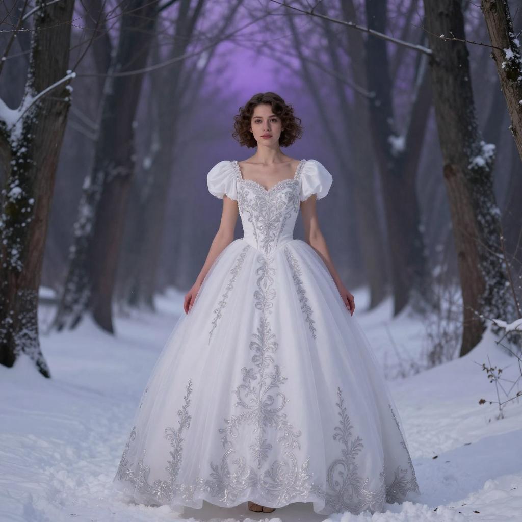 A young woman with short curly hair and a slender frame wearing an elegant white ball gown with puffed sleeves and intricate silver embroidery. She stands in a snowy fantasy forest setting with bare dark trees and a violet twilight haze background, evoking a magical fairy-tale atmosphere.