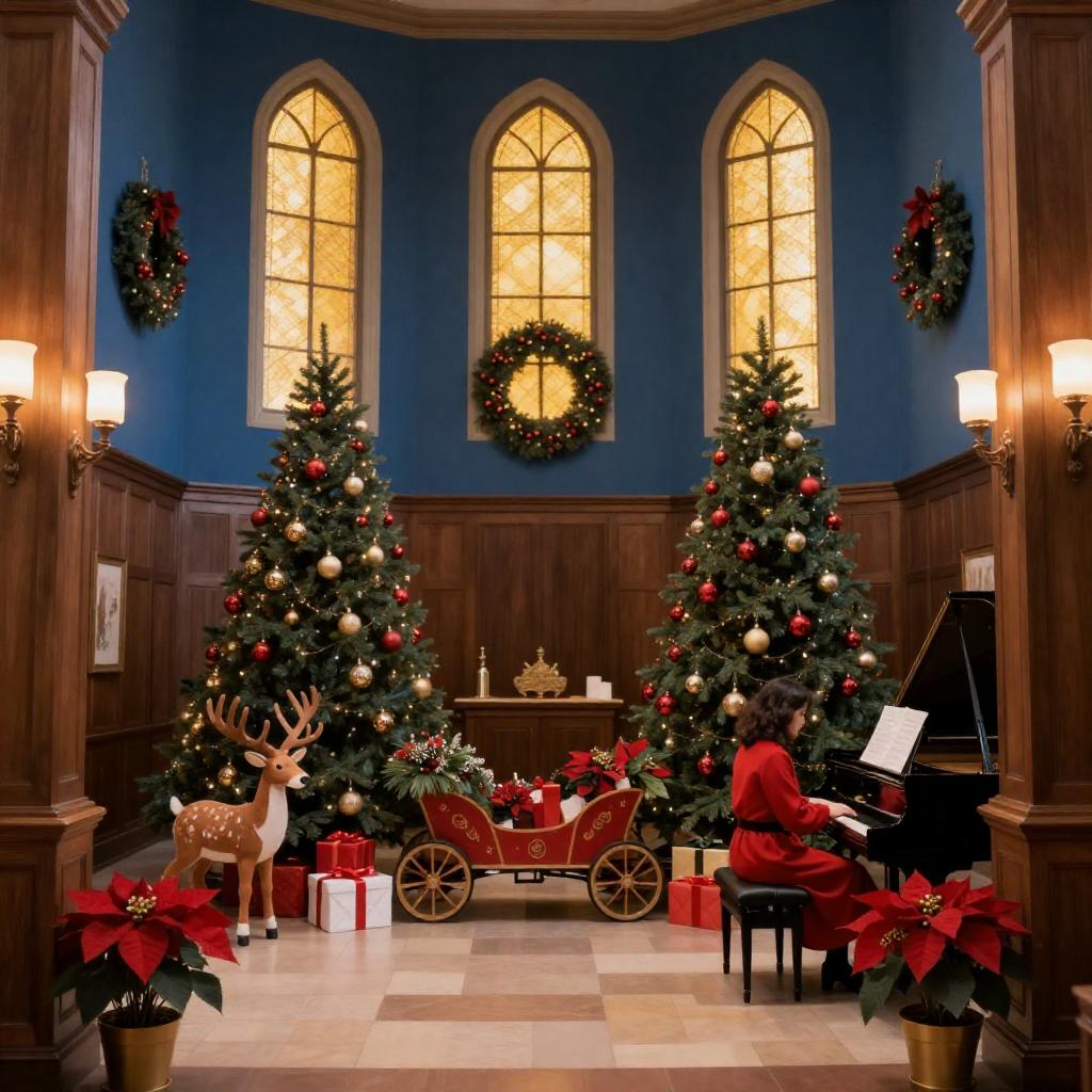 Photograph of a church interior. Christmas scene with two decorated Christmas trees, reindeer on a wagon, presents, poinsettias, and a piano. Blue wall with golden windows and wreaths. A person in a red outfit sits at the piano. Warm lighting. Wooden panels frame the scene.