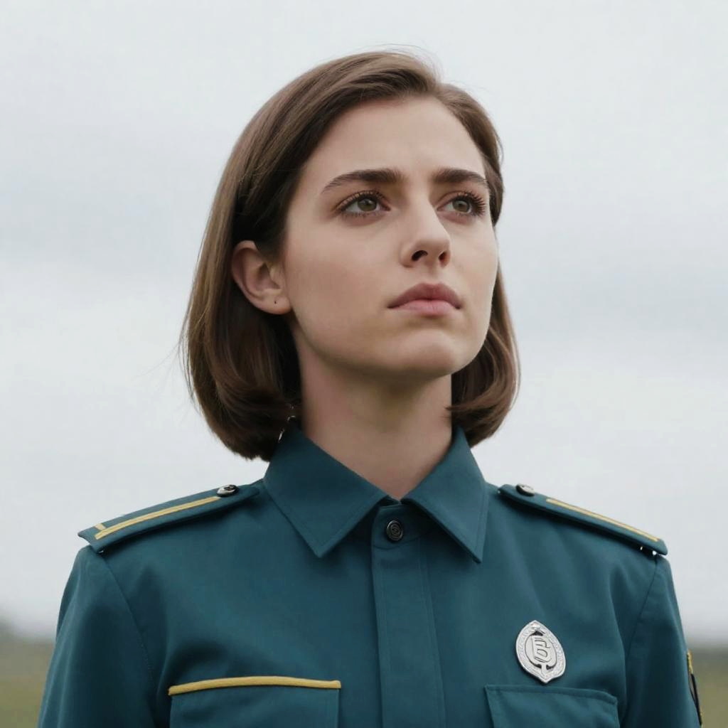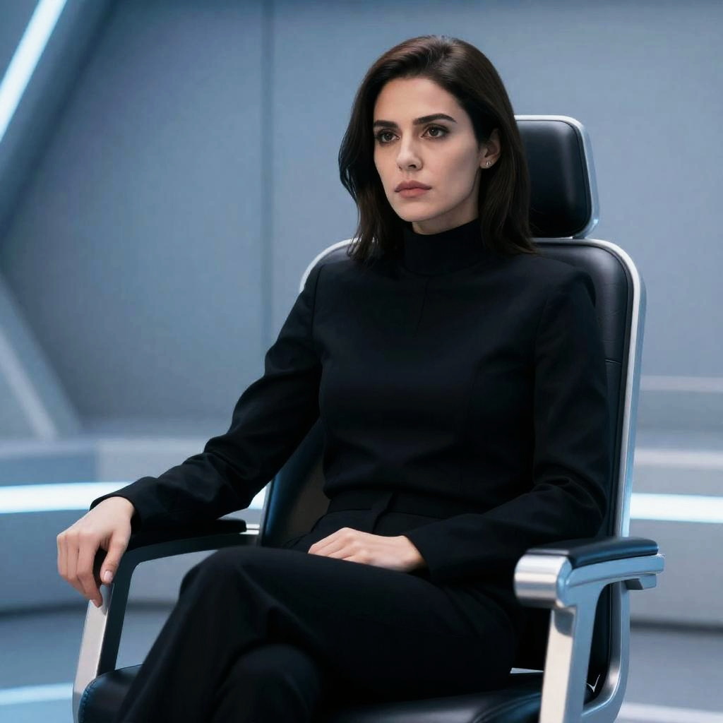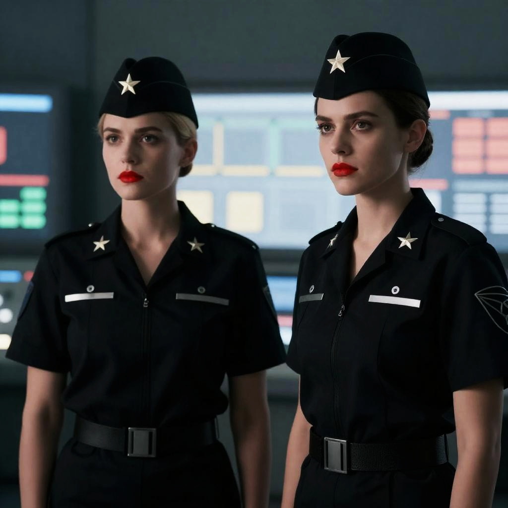 Two women in black military-style uniforms with caps and star emblems, standing in a dimly lit control room. The woman on the left has blonde hair and red lipstick, looking to the side. The woman on the right has dark brown hair, red lipstick, and intense gaze, looking forward. Bright, colorful control panels in the background. Both women have intense facial expressions.