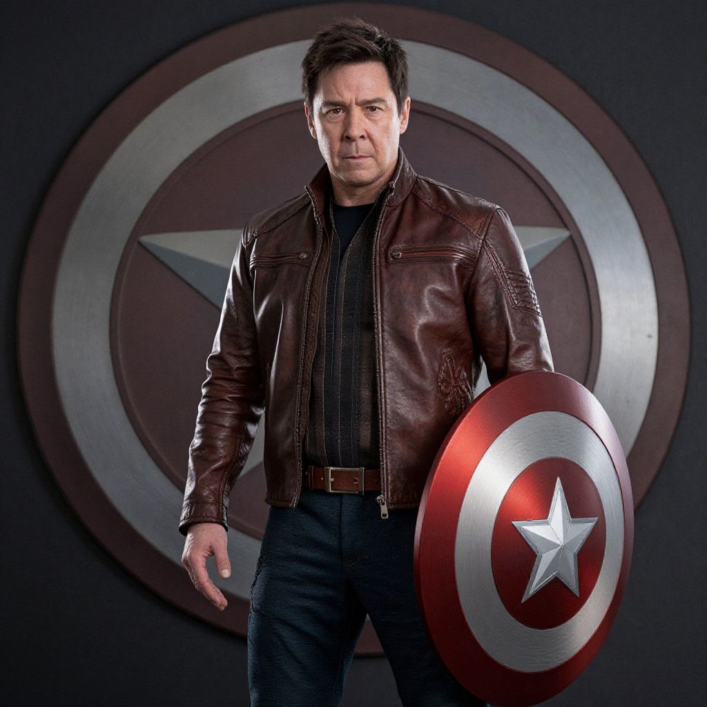 "Shang Chi Avengers, man in a brown leather jacket standing in front of a large shield"