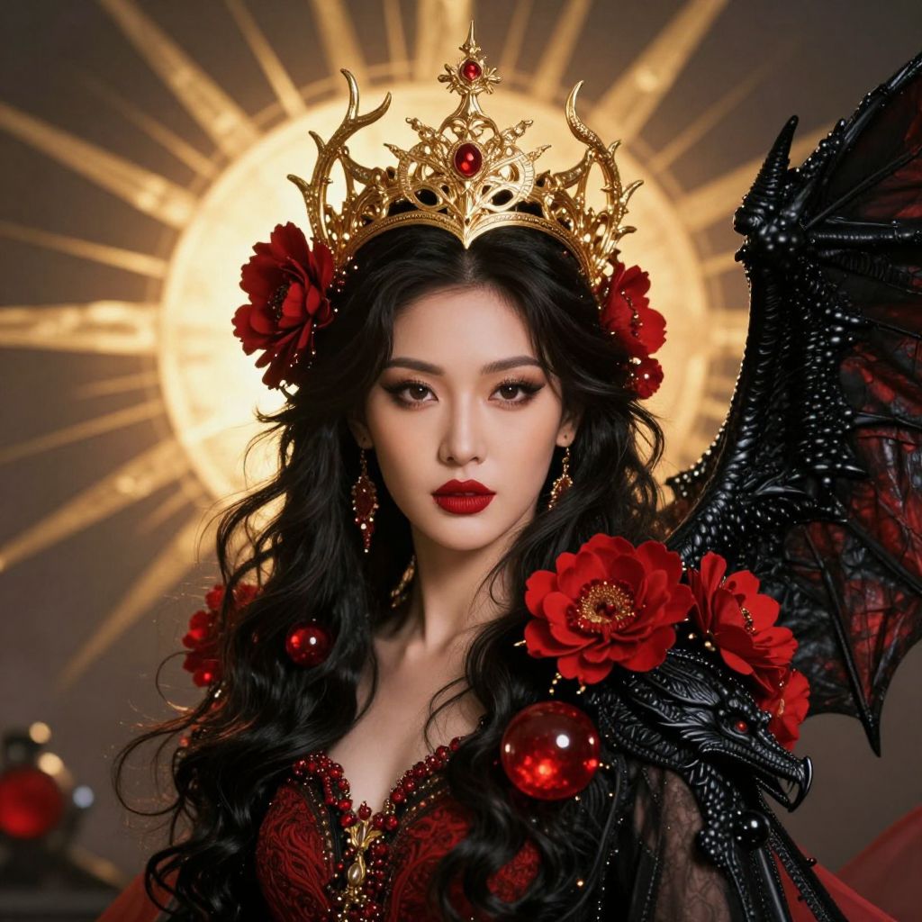 A radiant woman adorned with a golden crown and a black dragon's wing, set against a sunburst backdrop, exudes an otherworldly elegance, her dark hair entwined with vibrant red flowers and enigmatic red orbs.