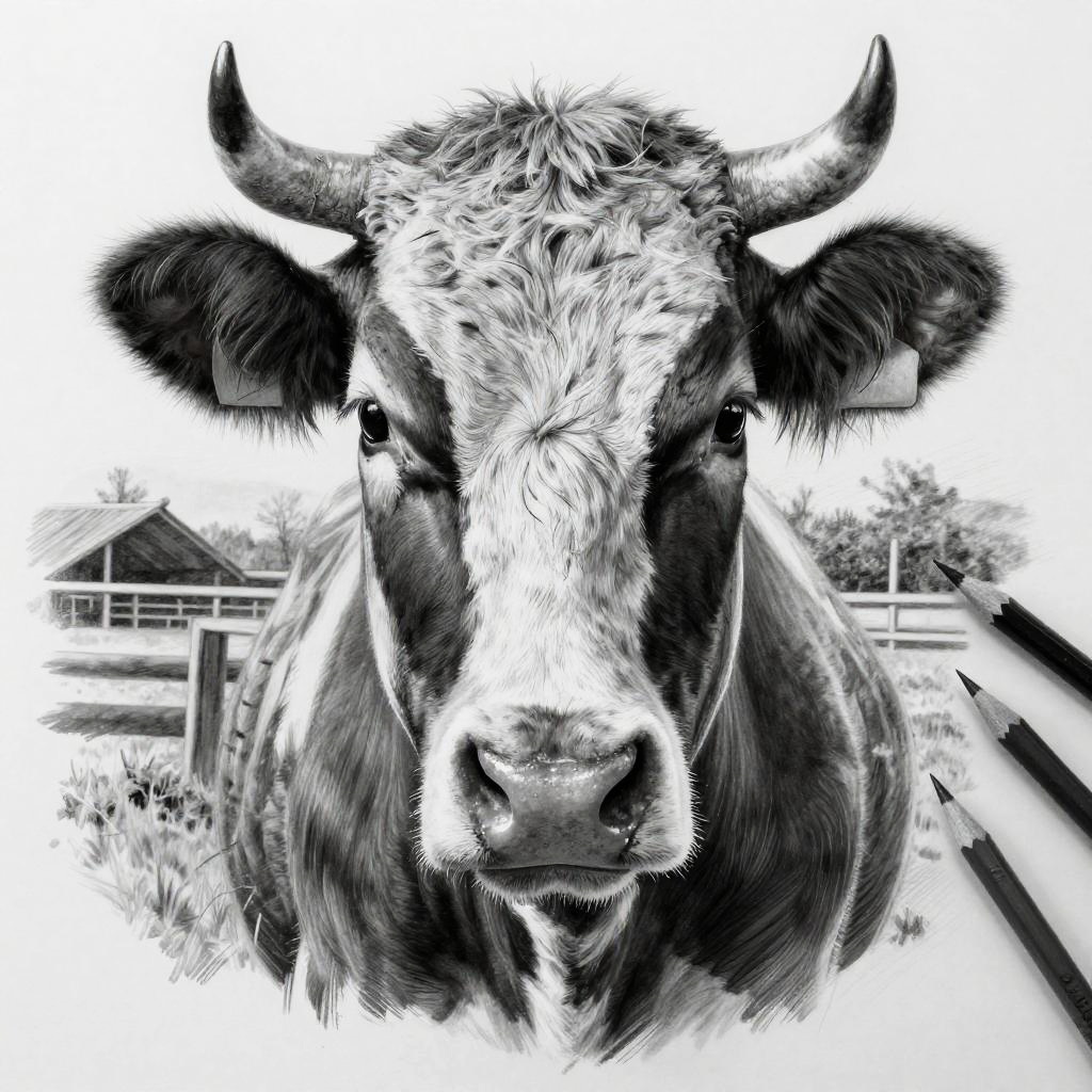 Realistic cow face drawing with highly detailed fur strokes, lifelike and soulful eyes, natural highlights and shadows accentuating three-dimensionality, set against a rustic farm background, created with soft pencils and blending techniques for photorealism.