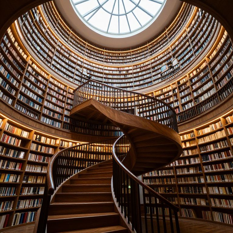 Spiraling wooden stairs ascend gracefully through a grand, circular library, illuminated by natural light streaming through a central skylight, revealing endless rows of books that encircle the space in multiple levels, creating an illusion of infinite depth within a single room.