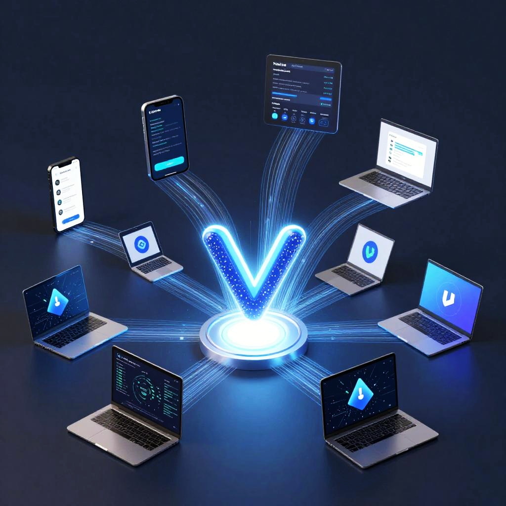 A conceptual art piece depicting Vue framework powering web applications, a glowing Vue logo at the center with streams of data flowing outward connecting to various devices like smartphones and laptops, modern digital art style, clean and high-tech visual storytelling