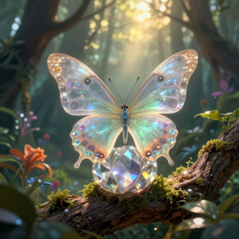 Craft an ethereal illustration blending fantasy with surreal aesthetics, reminiscent of Brian Froud's captivating world. Depict a close-up view of a delicate, translucent butterfly emerging from a mesmerizing crystal casing perched on an ancient tree branch against a backdrop of mysterious mist and vibrant flora. The butterfly's iridescent wings glimmer in hues reminiscent of precious gemstones, casting enchanting reflections onto the surrounding foliage as it spreads its wings to reveal intricate patterns and symbols. A soft, golden light filters through the dense forest canopy, illuminating the scene with an otherworldly glow that evokes a sense of wonder, magic, and discovery.